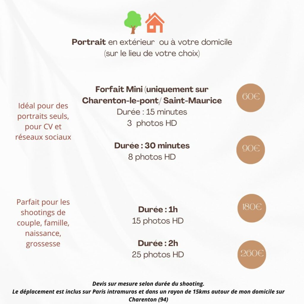 Les séances peuvent se dérouler dans le lieu de votre choix (extérieur ou à domicile), selon votre préférence et le style que vous souhaitez obtenir. Nous définirons ensemble le lieu idéal pour vos photos en fonction de vos envies. Je me déplace gratuitement à Paris et dans toute l’Île de France. Néanmoins, des frais de déplacement peuvent s’appliquer si le lieu nécessite l’usage de mon véhicule personnel ou l’obligation d’achat d’un billet de TER / train ou autres transports sur tarifé.