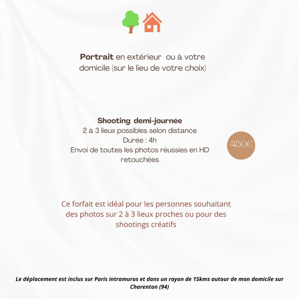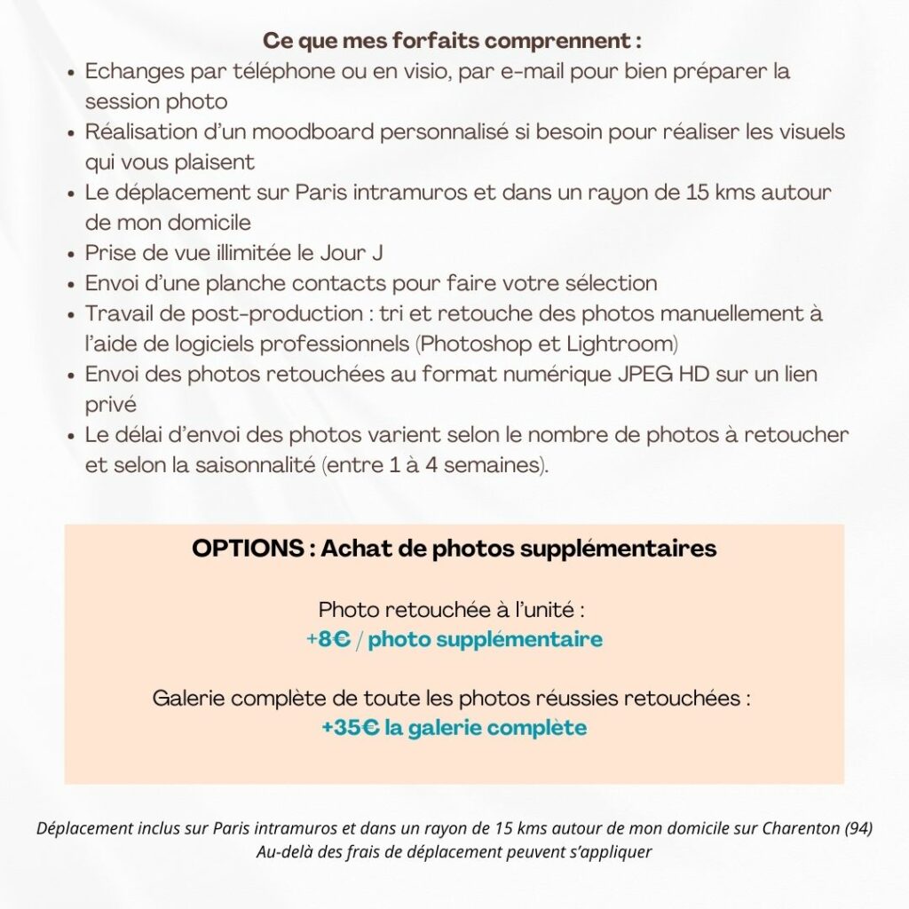 Shooting sur mesure possible en fonction de la durée de la séance, du nombre de lieux pour les photos, du nombre de photos souhaitées.