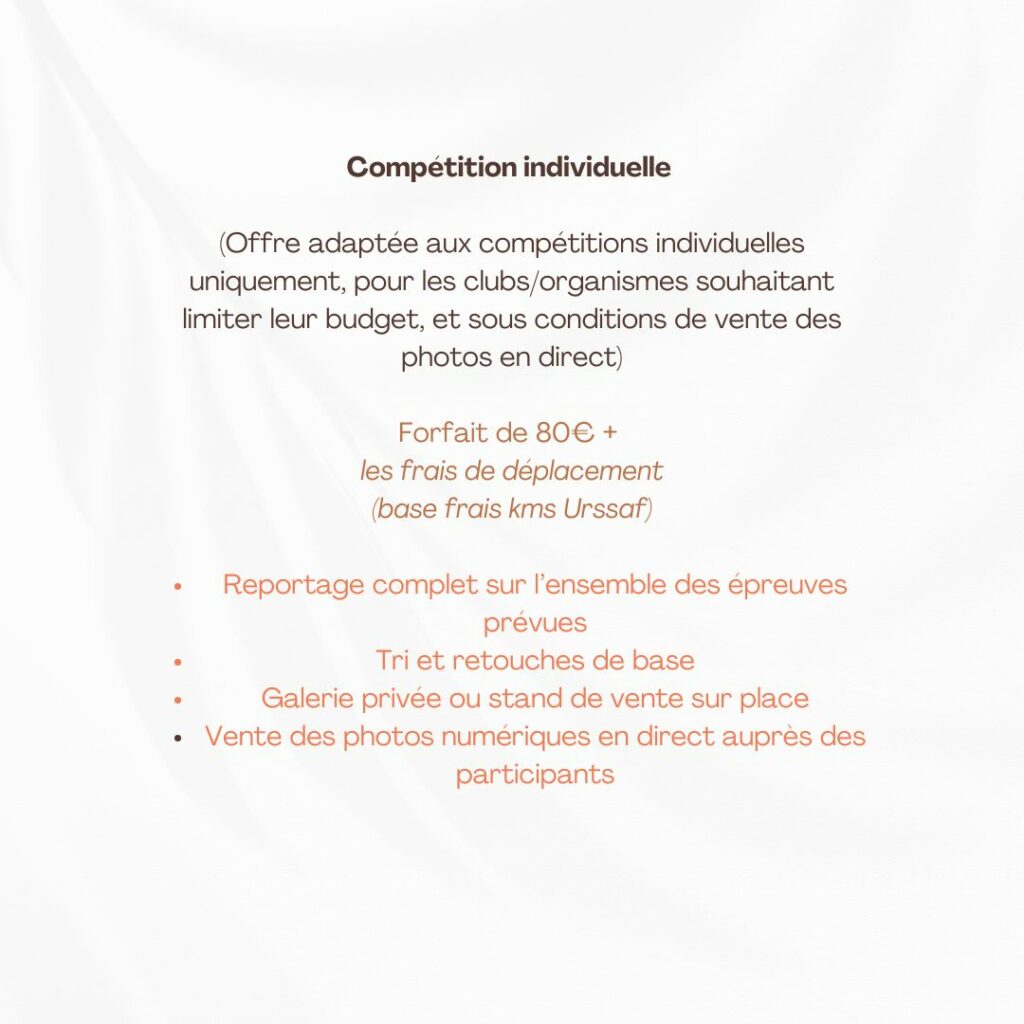 Chaque prestation est adaptée à vos besoins. Je vous accompagne de la préparation à la remise des images, avec un seul mot d’ordre : mettre en lumière votre art, votre passion, vos performances.